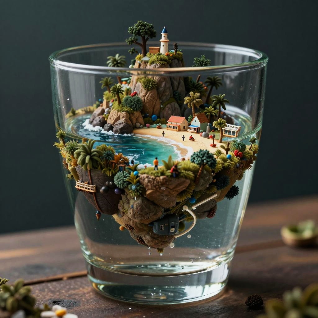 Magic realism, epic, ((Magic realism)) extreme close-up, ((island with beach scene miniature inside a drinking_glass of water)) fantastic surrealism, " 64k, highly detailed, UHD, HDR, octane render, whimsical scene of size juxtaposition. Playfully surreal, intricate details, ""magic realism, photorealistic rendering, soft lighting, vibrant colors, size play, vivid magic realism by Hans-Werner Sahm and Marc Adamus, 64K, 3d render, depth by atmosphere, great color range""