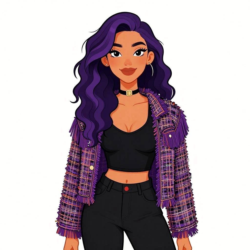Digital illustration of a confident woman with long purple hair, wearing a black crop top, high-waisted black pants, and a purple plaid jacket