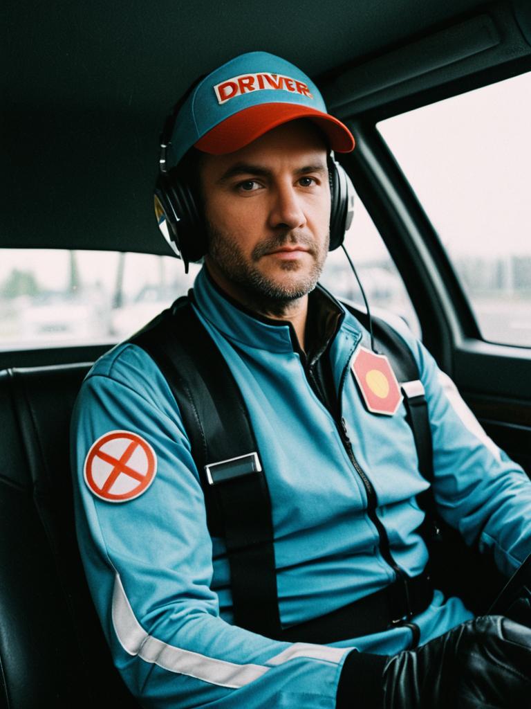 Man in Driver costume, cosplay editorial portrait, cinematic realism