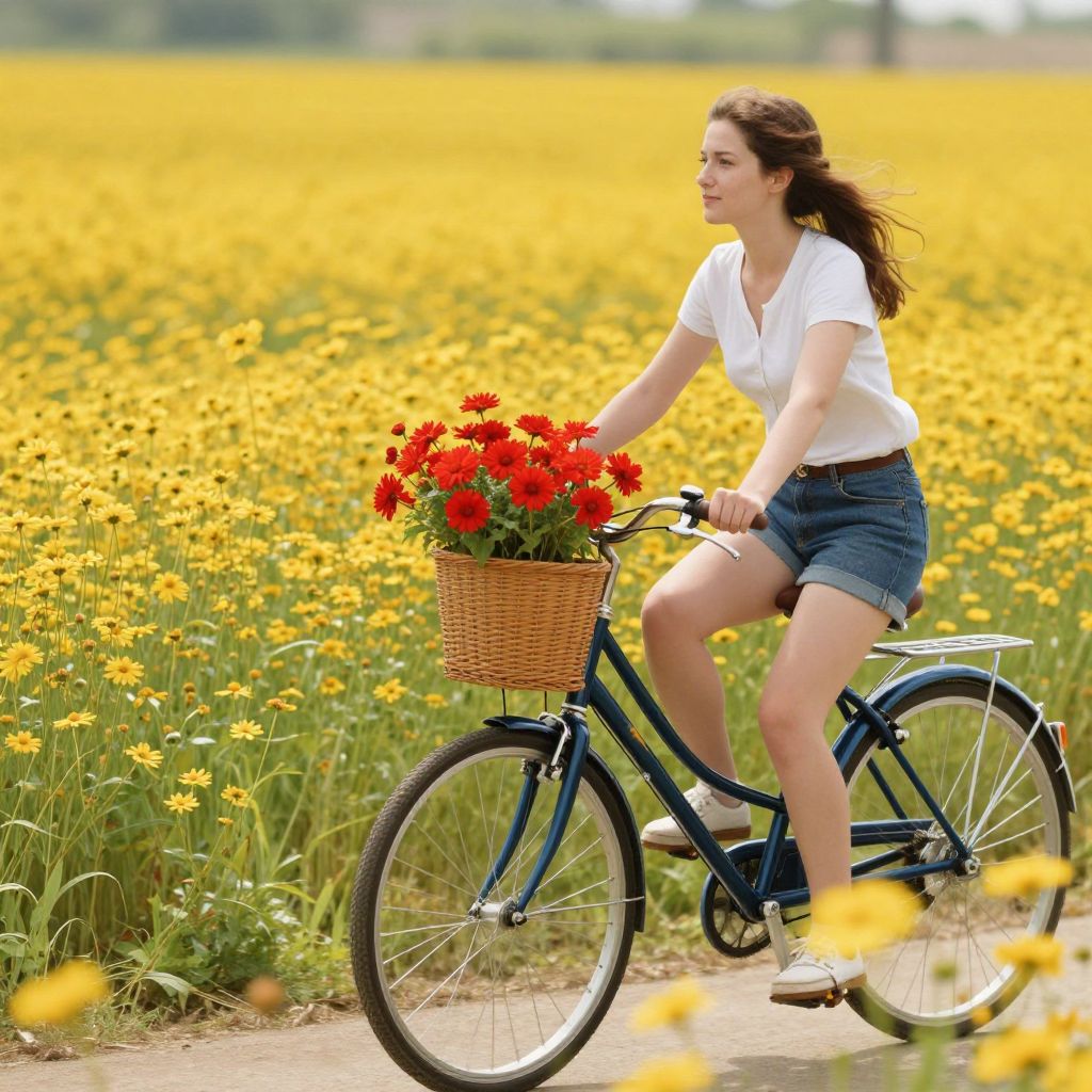 Amidst a vibrant field of golden blooms, a woman pedaling her bicycle cradles a basket of fiery red flowers, embodying a harmonious blend of freedom and serenity, while the gentle rustle of leaves and the warmth of the sun evoke a timeless connection to nature.