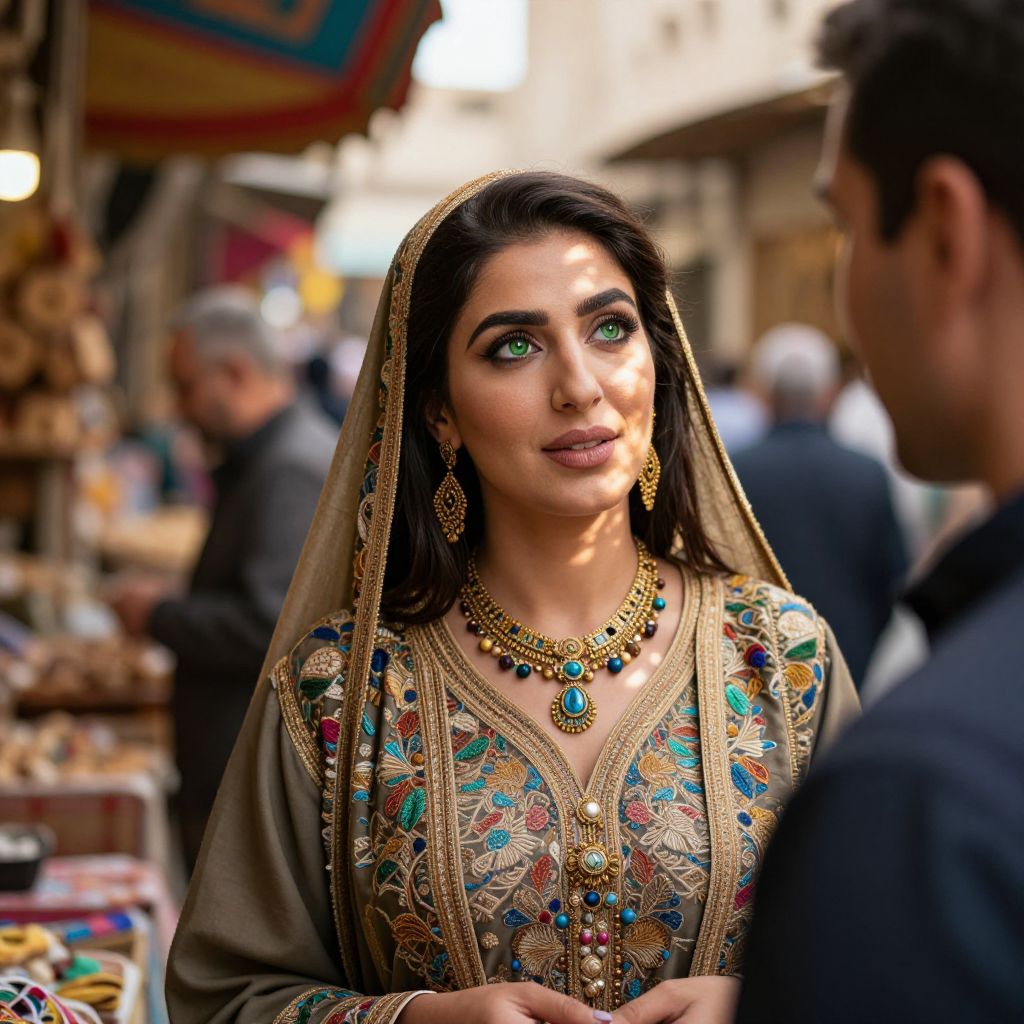 Photograph of a South Asian woman with medium brown skin, dark brown hair, and striking green eyes, wearing an intricately embroidered traditional Pakistani outfit with a beige veil. She is adorned with gold jewelry, including a large necklace and dangling earrings. Her makeup is subtle, highlighting her eyes and lips. She is engaged in conversation with a man in a dark shirt, visible only from the side. The background is a bustling outdoor market with blurred figures and colorful stalls. The lighting is natural, enhancing the rich colors of her attire.