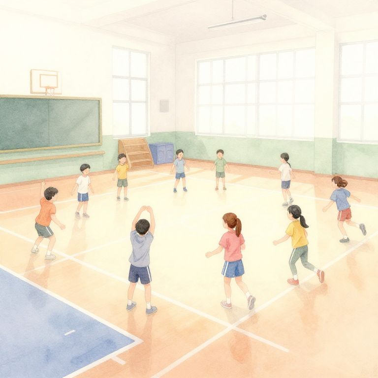 School gym drawing, watercolor painting highlighting a school gym during a physical education class, kids stretching and running, soft pastel colors, light and airy feeling, impressionistic technique