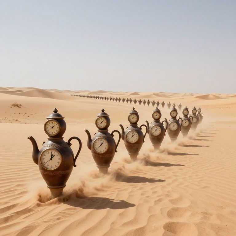 A surreal procession of anthropomorphic teapots, each crowned with a ticking clock face, strides across a desolate desert, leaving trails of cascading sand in their wake, as if time itself is leaking into the arid landscape.