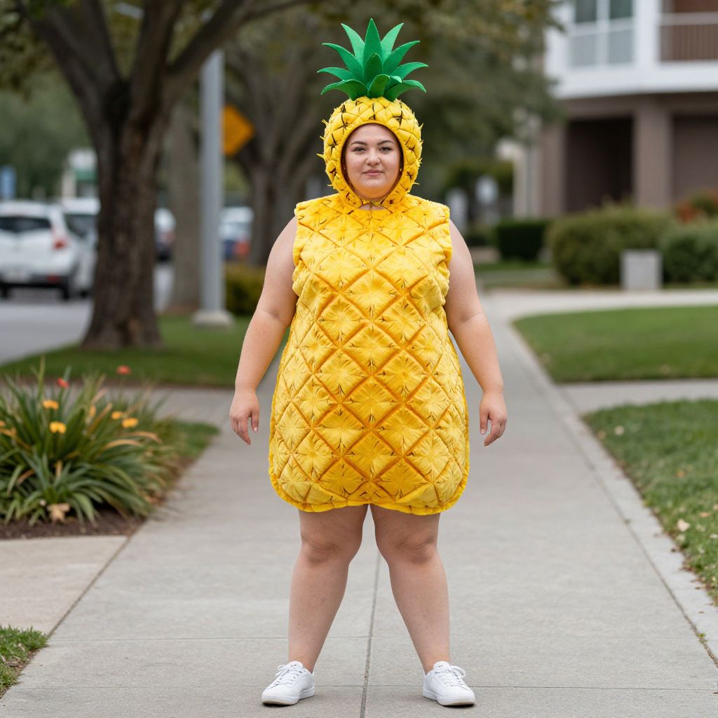 Pineapple Costume Plus Size, dressed in a pineapple costume standing on a sidewalk