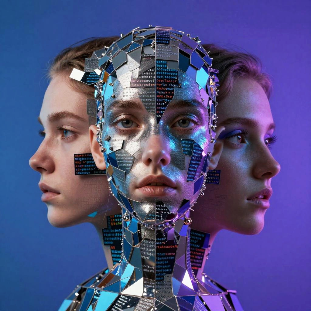 AI made pictures capturing a surreal portrait where the subject’s face morphs into a mosaic of code and geometric shapes, shimmering metallic textures, vivid color palette with blues and purples, representing the integration of human and artificial intelligence.