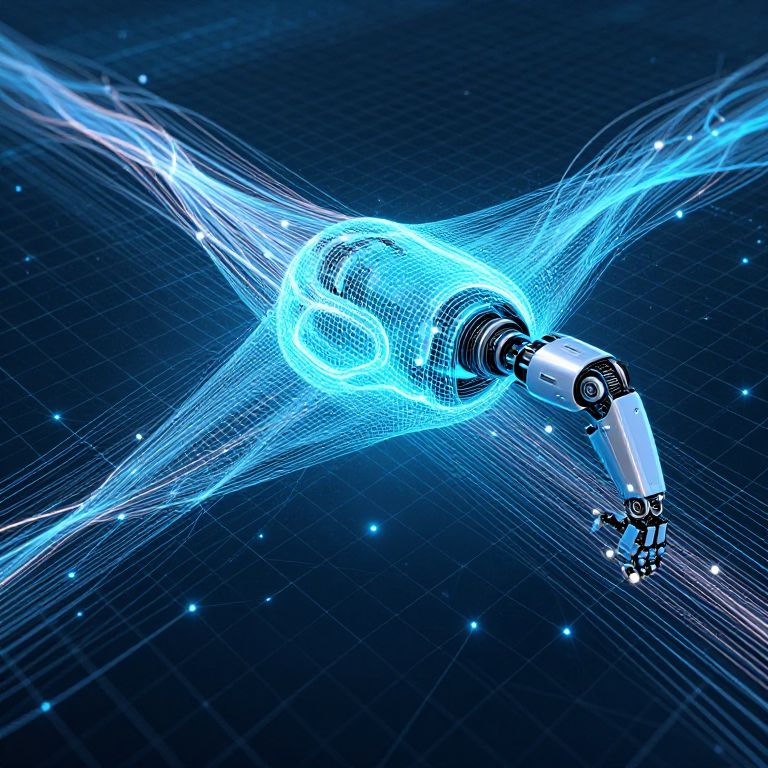 Digital illustration of a futuristic robotic arm emitting blue energy waves, set against a dark, starry grid background.