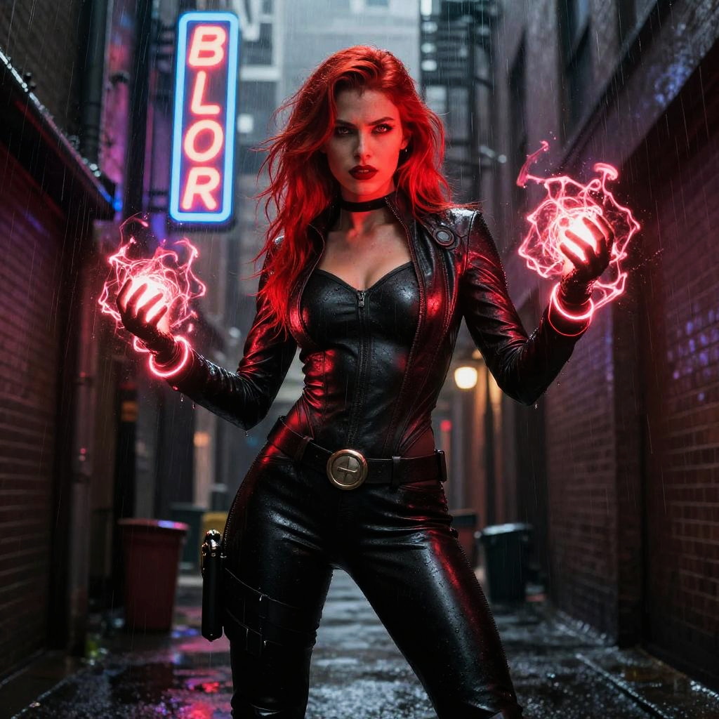 Photorealistic digital artwork of a fierce, red-haired woman with glowing red energy in her hands, standing in a rainy, dimly-lit alley. She wears a tight, black, leather catsuit with a zipper and belt, accentuating her curvy physique. A neon "BLOR" sign hangs in the background, casting a blue glow. Her intense expression and confident stance are highlighted by the wet, glistening texture of her outfit. The alley's brick walls and puddles add a gritty, urban atmosphere. Her hair is wild and wet, contrasting with the controlled glow of her energy.