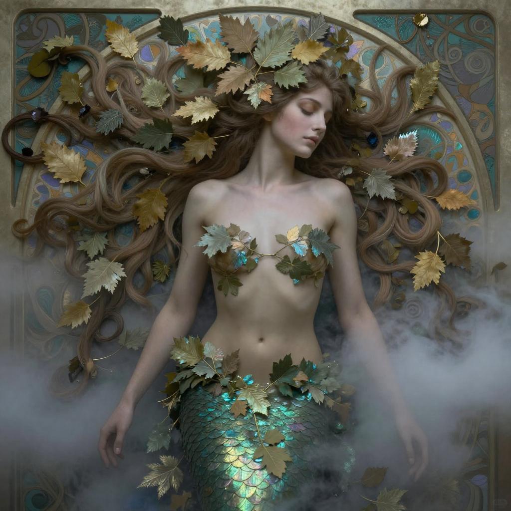 Realistic photo.A hauntingly beautiful female ocean siren surrounded by fog and smoke, her hair a cascade of leaves. Inspired by Eyvind Earle, Alphonse Mucha. Mixed media with soft illumination, intricate details, and iridescent highlights. realistic photo