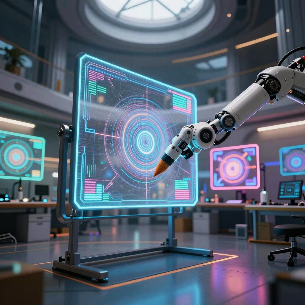 ComfyUI IPAdapter visualized as a floating holographic device in a dimly lit high-tech room, neon lights reflecting off glass surfaces, intricate circuit patterns glowing in soft blues and purples, sci-fi ambiance.