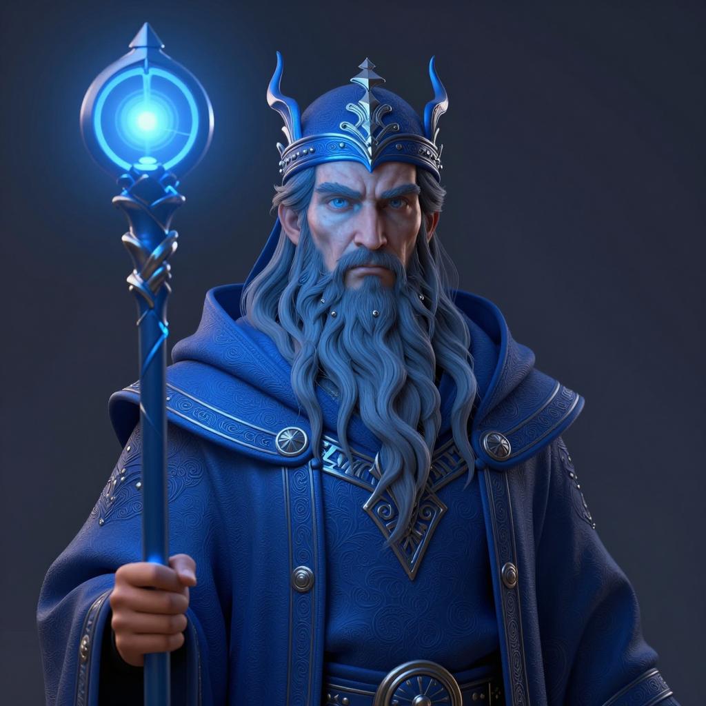 Gradient ancient wizard with glowing staff portrait, deep royal blue with a subtle ornate pattern, dramatic close-up portrait reminiscent of Caravaggio, ultra high detail, NVIDIA Iray render, ultra high definition, ArtStation quality, smooth, sharp focus, Photorealism, depth of field, 3D super resolution, octane render, award-winning photo