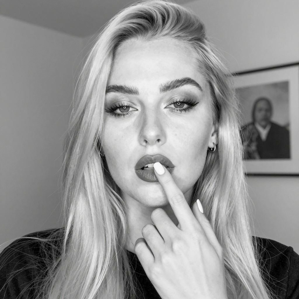 Black and white photograph of a woman with long, straight blonde hair, heavy makeup, and full lips. She is touching her lips with her right index finger. Her eyes are slightly open with a neutral expression. Background includes a blurred indoor setting with a framed picture. She is wearing a dark top.