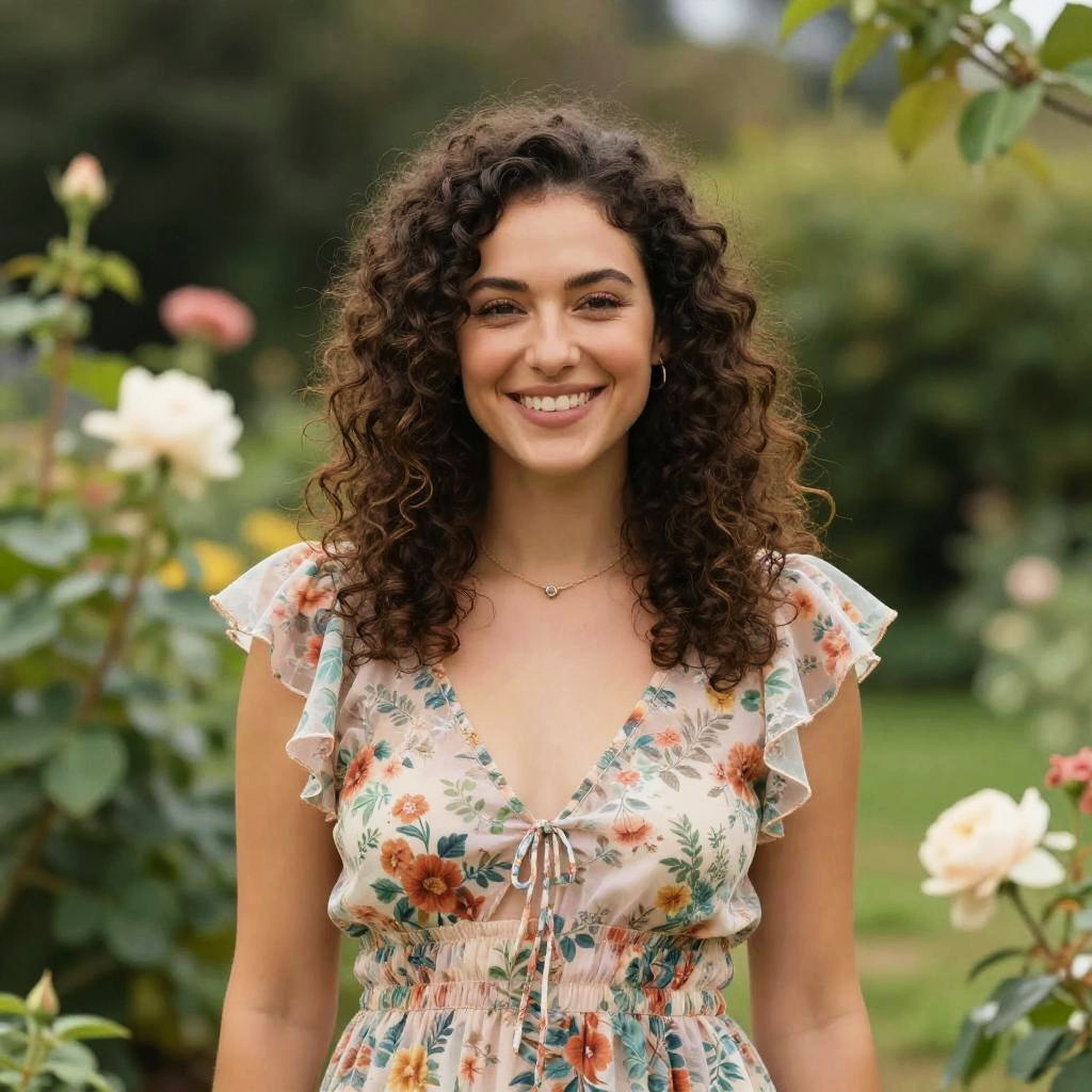 Photograph of a young woman with long, curly dark brown hair, smiling brightly. She has a light olive skin tone and wears a sleeveless, floral-print dress with a low V-neck and ruffled shoulders. The dress features a mix of orange, green, and white flowers. She has small hoop earrings and a delicate necklace. The background is a lush garden with blurred greenery and blooming roses in white and pink. The image is brightly lit with natural sunlight, highlighting her joyful expression and curly hair.