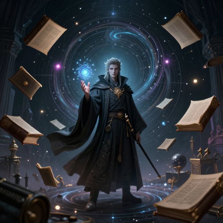Digital artwork of a regal, blue-eyed wizard in black robe, holding a staff, surrounded by floating books, stars, and a cosmic backdrop.