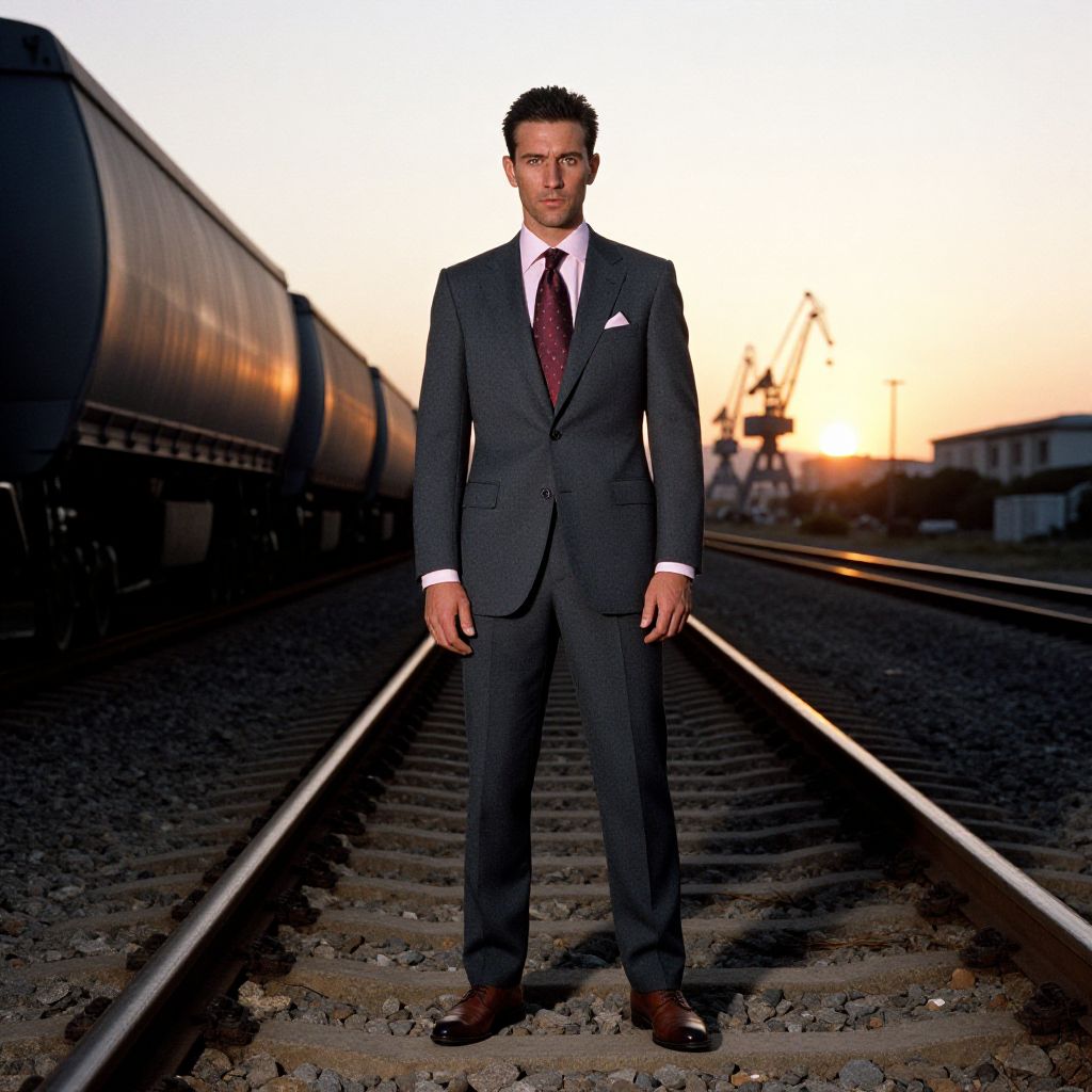 A man, charcoal gray slim-fit suit, light pink French cuff shirt, patterned silk tie in burgundy, brown leather oxford shoes, pocket square in white, standing on railway tracks intersecting, massive trucks lined up, distant cranes silhouetted against sunset, AgfaColor film style, confident expression. Man has masculine face and piercing eyes