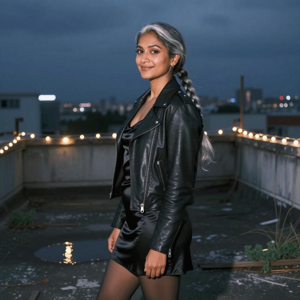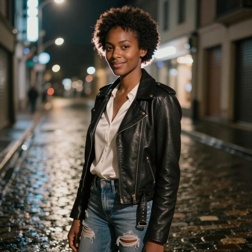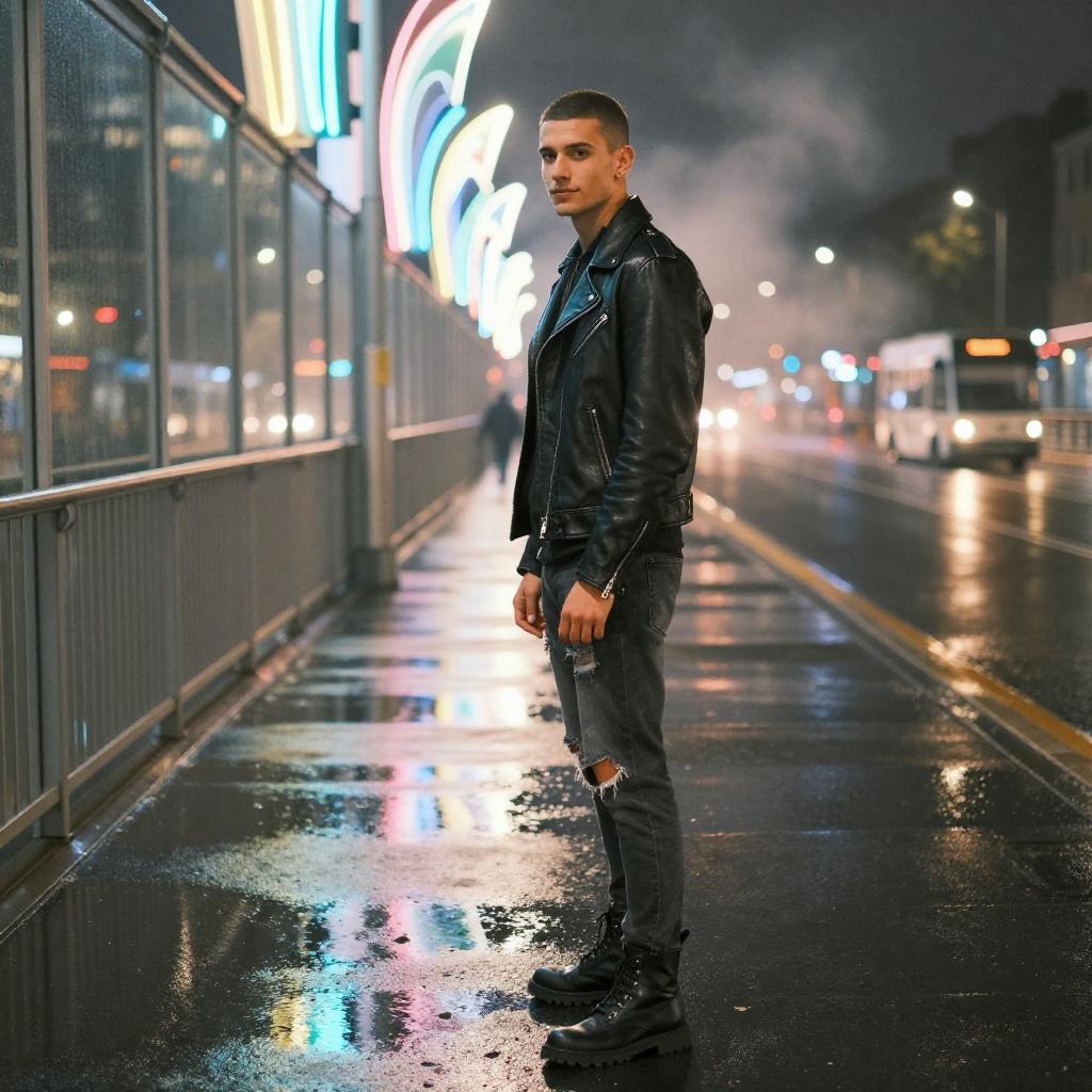 Realistic, RAW photo, DSLR, film grain, Fujifilm XT3, night shot, young athletic man with short cropped hair and intense gaze, sleek black leather biker jacket with silver zippers, ripped dark denim jeans and chunky combat boots, elevated rain-drenched pedestrian bridge lined with neon art installations and reflective glass panels, puddles forming fragmented reflections, distant tram lights and wisps of incense-like steam, strong backlight rim light, creamy bokeh, high contrast filters, subtle lens flare, moody atmosphere, puddle reflections, side profile, gentle smile, looking at viewer, 35mm lens, shallow depth of field, natural skin texture, editorial street fashion vibe