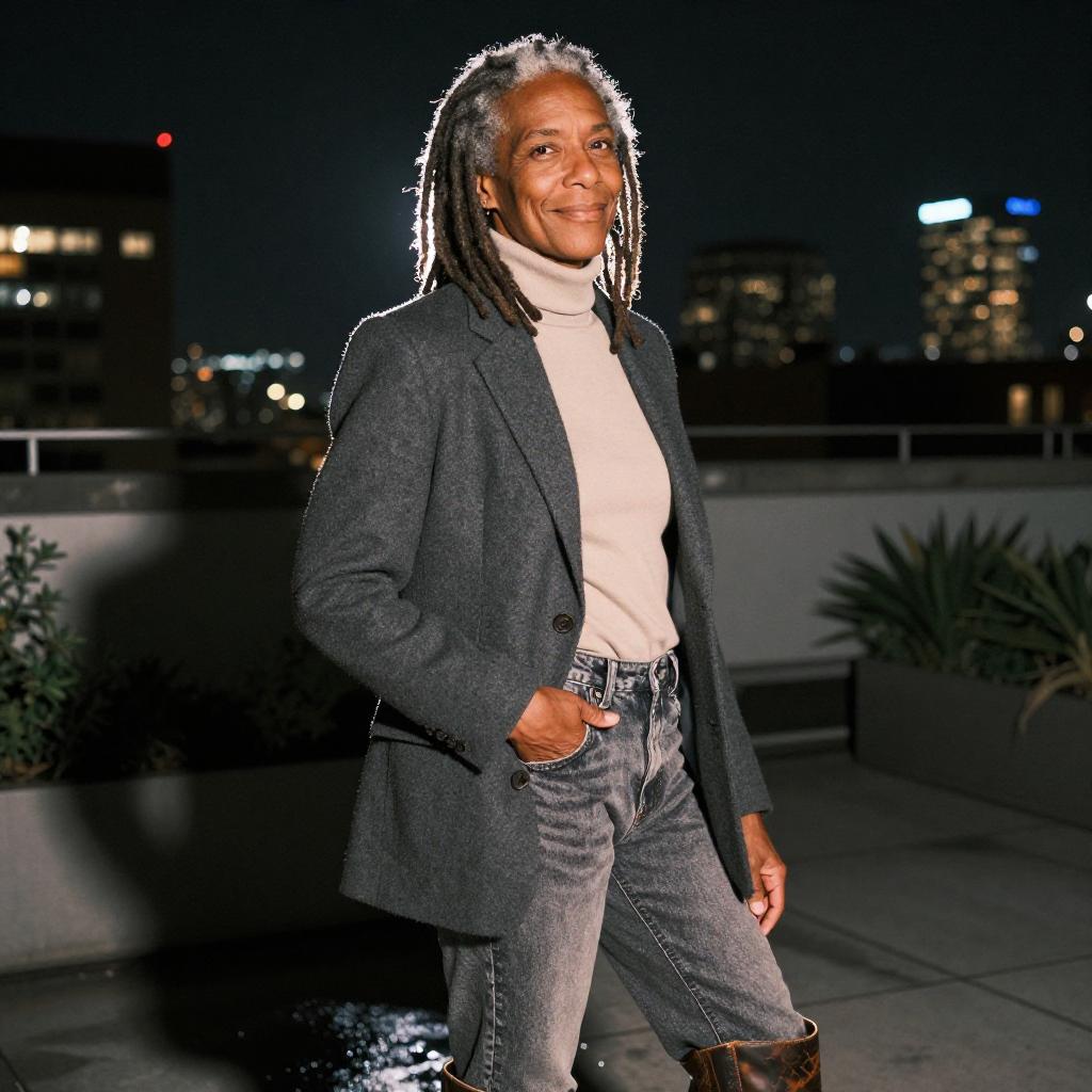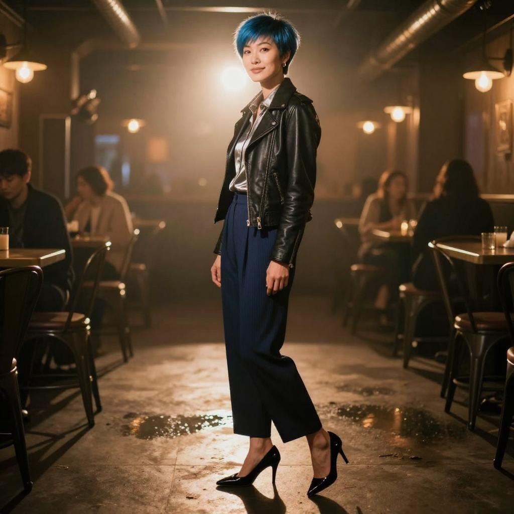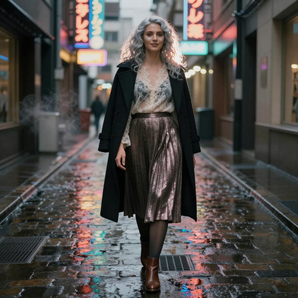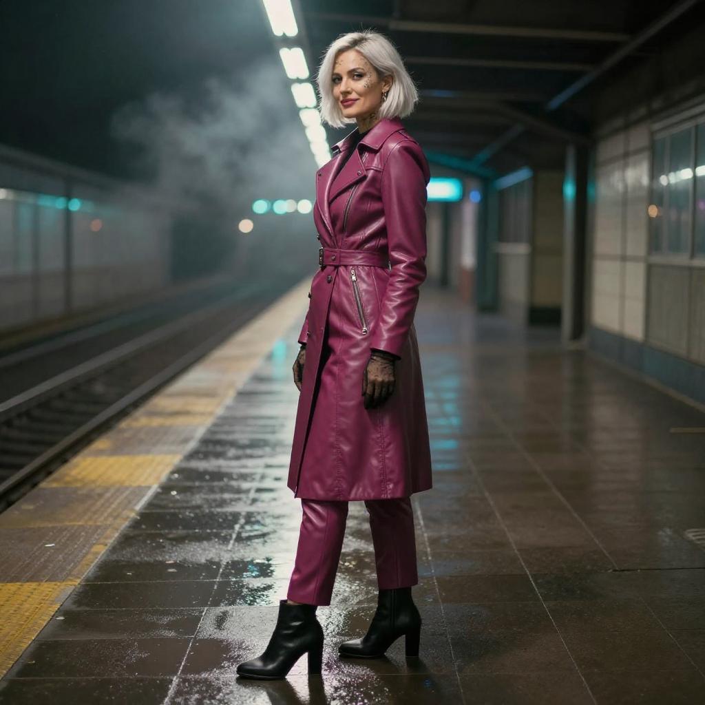 Realistic, RAW photo, DSLR, film grain, Fujifilm XT3, night shot, young athletic man with short cropped hair and intense gaze, sleek black leather biker jacket with silver zippers, ripped dark denim jeans and chunky combat boots, elevated rain-drenched pedestrian bridge lined with neon art installations and reflective glass panels, puddles forming fragmented reflections, distant tram lights and wisps of incense-like steam, strong backlight rim light, creamy bokeh, high contrast filters, subtle lens flare, moody atmosphere, puddle reflections, side profile, gentle smile, looking at viewer, 35mm lens, shallow depth of field, natural skin texture, editorial street fashion vibe