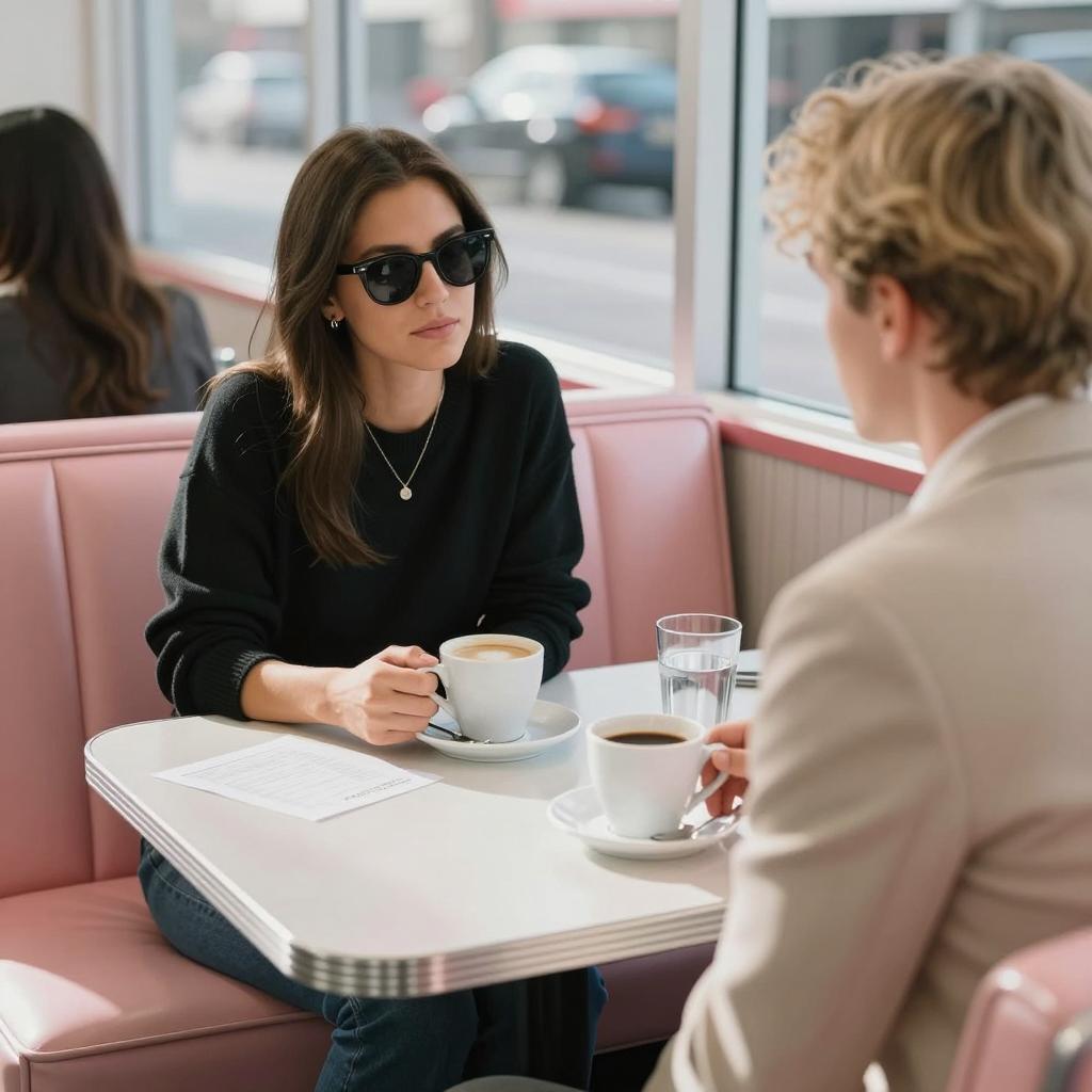 Young woman with brown hair in red jacket and pants, sitting in floral armchair, sipping from white mug, eyes closed. Background: orange walls, green-blue patterned curtains, small table with two sandwiches. Casual, relaxed setting.