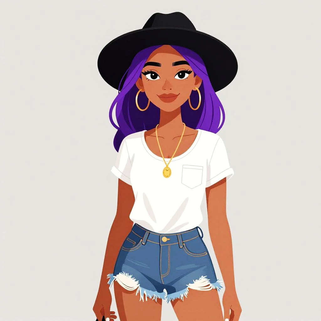 Digital illustration of a smiling woman with purple hair, wearing a straw hat, colorful floral crop top, black shorts, hoop earrings, and bracelets, standing