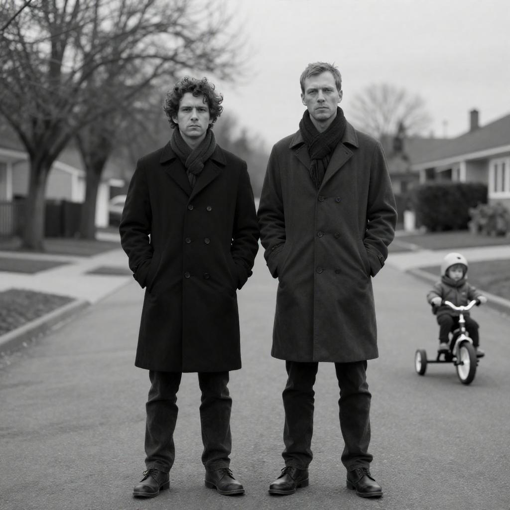 Black and white photograph of two men standing on a suburban street. Both wear long, dark coats and scarves, with one man's hands in his pockets. Curly-haired man on left, serious expression. Slightly taller, pale-skinned man on right, stern expression. Background includes trees, a fence, and a child's tricycle on the right. Overcast lighting.