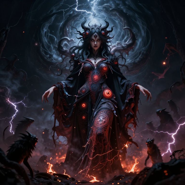 Digital artwork of a dark, mystical sorceress with glowing red eyes, black hair, and intricate robes, surrounded by lightning, demons, and flames