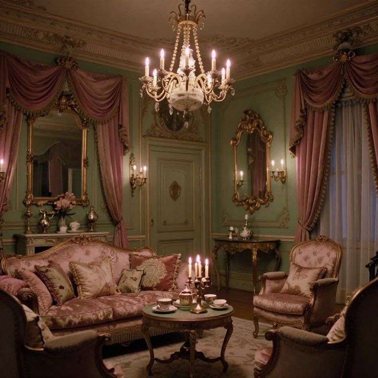 The image depicts a Victorian-era opium den styled in the fashion of a scene from Sofia Coppola's Marie Antoinette movie. The room is adorned with intricate, ornate details, including elaborate moldings, mirrors, and drapery, evoking a sense of opulence and grandeur. The color palette is dominated by soft, muted tones of green and pink, creating a warm, intimate atmosphere. A large, ornate chandelier hangs from the ceiling, casting a gentle light over the scene. The room is furnished with plush, cushioned seating, including a large sofa and several armchairs, all covered in rich fabrics. A small table in the center holds a tea set, with candles flickering on a stand, adding to the cozy ambiance. The overall composition is balanced, with objects arranged in a harmonious manner, creating a sense of depth and perspective. The interplay of colors, textures, and shapes contributes to the rich, detailed visual experience, capturing the essence of a bygone era.