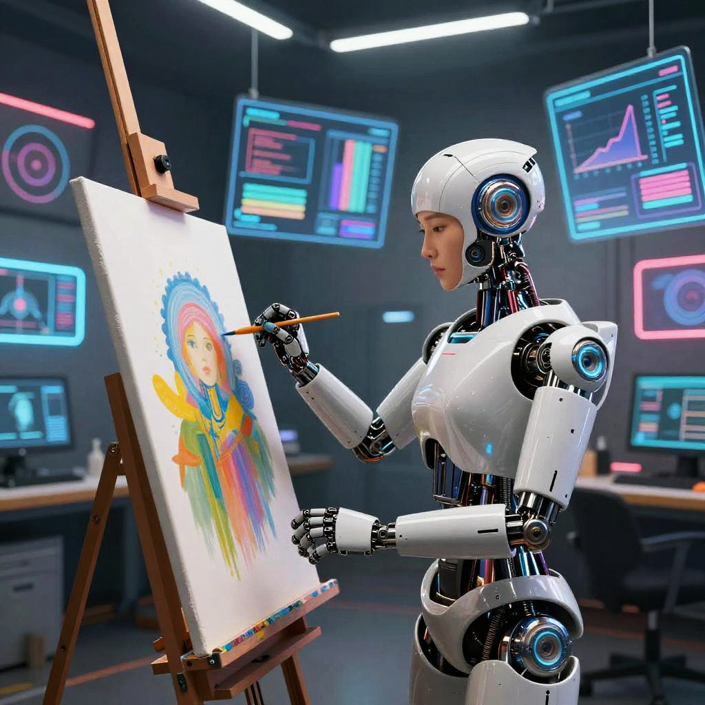 Photorealistic digital artwork depicting a futuristic, white humanoid robot with sleek, metallic joints and blue glowing accents, painting on an easel. The robot has a feminine form, with a smooth, featureless face, and is using a paintbrush to add vibrant colors to a portrait on the canvas. The background features a high-tech control room with multiple glowing, holographic screens displaying various data and graphs in bright colors. The setting is illuminated by a circular, white overhead light, creating a futuristic and sterile atmosphere. The robot's left hand holds the easel, while its right hand delicately applies the brushstroke.
