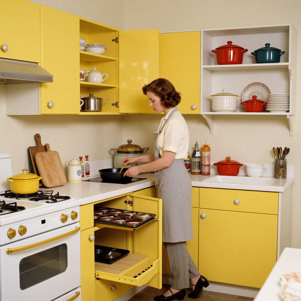 Woman in a 1930s-style kitchen preparing food, surrounded by vibrant yellow cabinetry featuring open slots for cookie sheets, pans, and cutting boards, alongside a retro stove and shelves stocked with colorful cookware and dishes.
