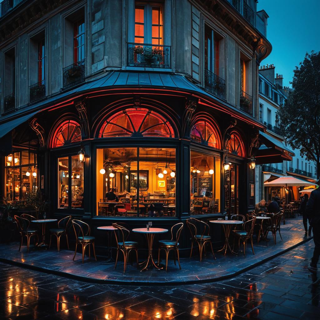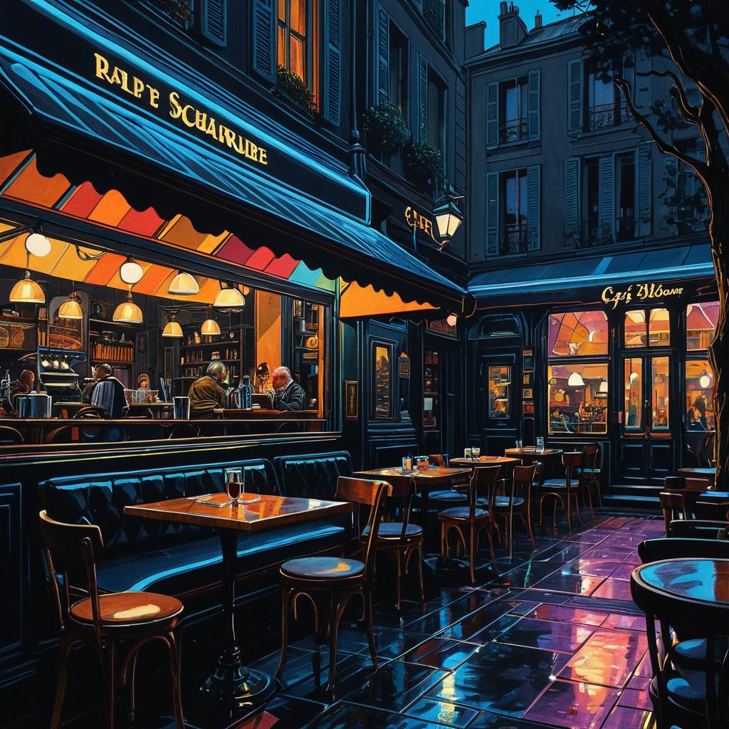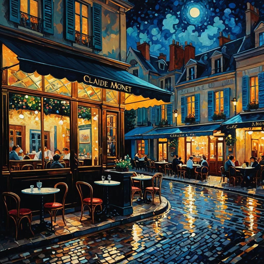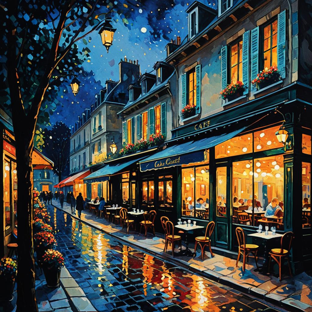 Impressionist style painting of a cozy Paris street cafe at evening with warm glowing lights and rain-soaked cobblestone reflections. Features outdoor seating, window flower boxes, and softly lit street lamps under a starry sky. The vibrant scene captures a nostalgic, artistic atmosphere in a country village night setting.
