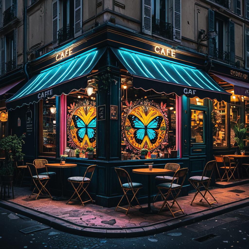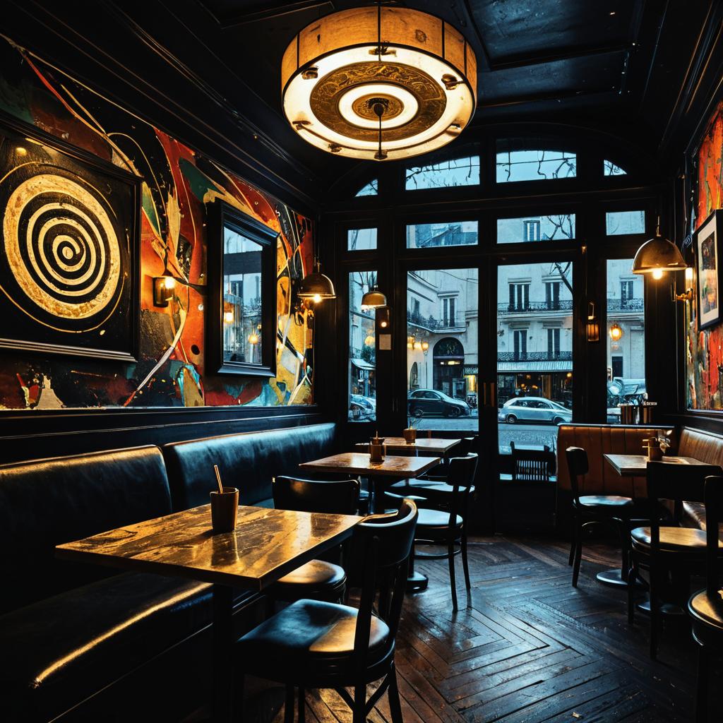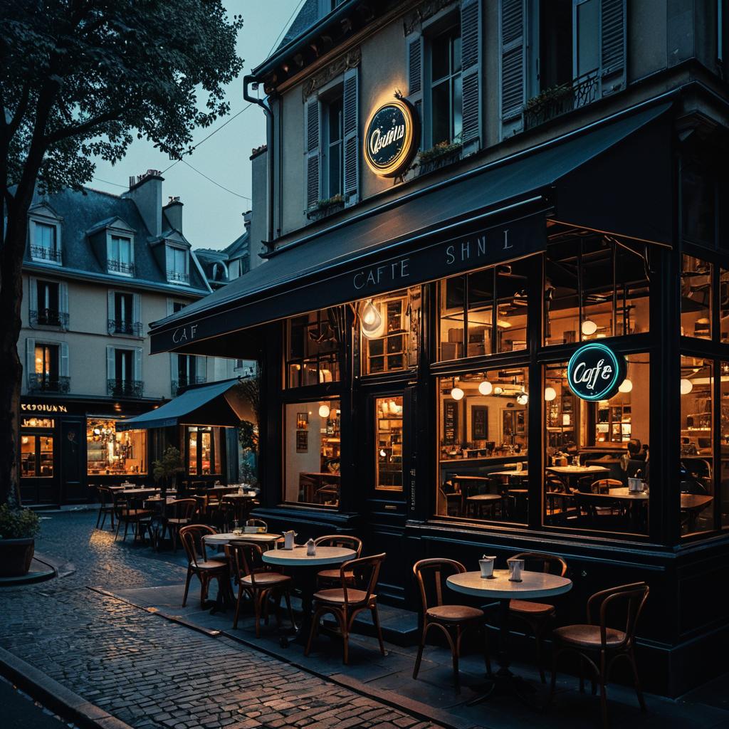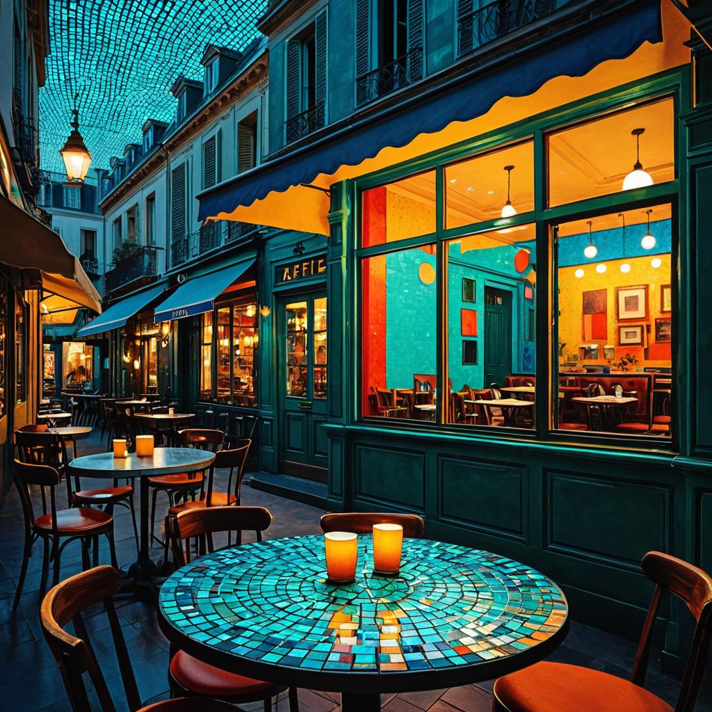 Impressionist Painting Paris style cafe, cozy atmosphere, pearl locket medallion shimmering with colors. highly detailed, high resolution, evening glow, country village night, raytraced reflections, dramatic lighting. 12k vibrant colors, neon ambiance, abstract black oil, detailed acrylic, grunge, intricate complexity, photorealistic, Claude Monet, Mary Cassatt, Paul Cézanne print, perfect composition, beautiful detailed intricate insanely detailed velvet render trending on artstation, 12k artistic photography, photorealistic concept art, soft natural volumetric cinematic perfect light, chiaroscuro, award-winning photograph, masterpiece, kids story book style, muted colors, watercolor style.