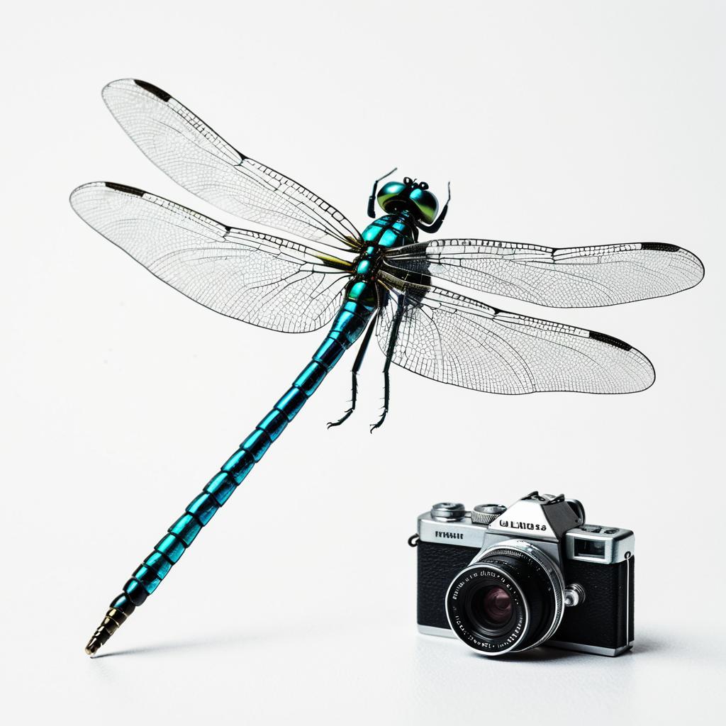A mystical glass dragonfly holding a camera, created by Gilbertson, Moebius. Styled as a collectible with soft lighting on a white background.
