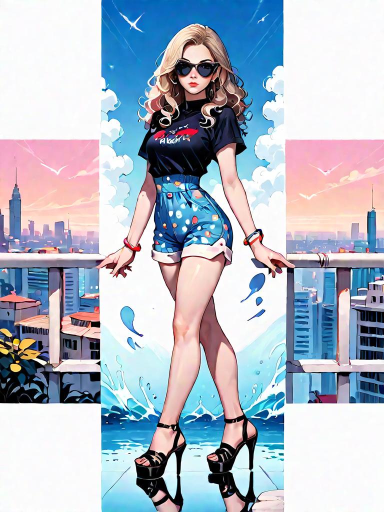 Digital illustration of a fashionable young woman with long wavy blonde hair wearing black sunglasses. She is dressed in a blue paisley patterned romper with short sleeves, round neckline, fitted waist, and thigh-length shorts. She accessorizes with thin bracelets and black high-heeled sandals, standing confidently against a white studio background with urban cityscape panels on the sides.