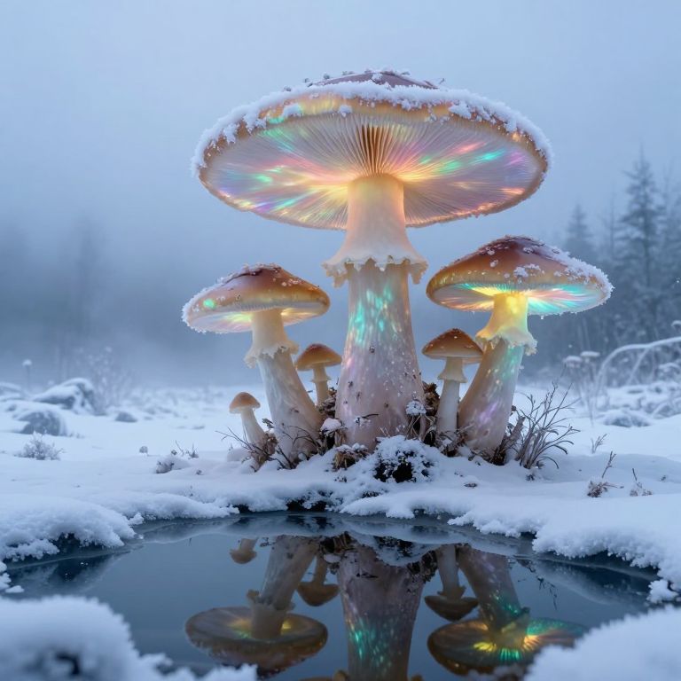 Giant, luminescent mushrooms with iridescent caps and frost-dusted edges rise majestically from a serene, snow-covered landscape, casting surreal reflections in a tranquil pool below, where the boundary between earth and sky dissolves into a dreamlike haze.