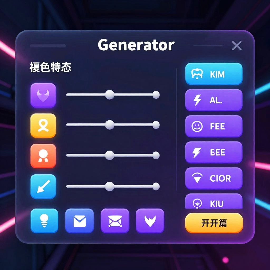 Digital screenshot of a "Generator" interface with neon blue, purple, and orange buttons, featuring symbols for Kim, AL, FEE, BEER