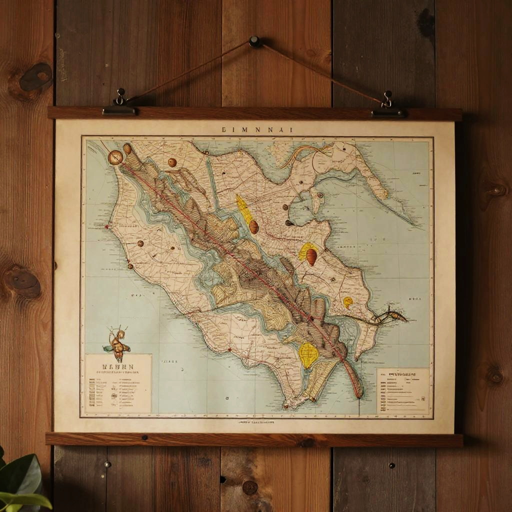 Displayed vintage map hanging on a rustic wooden wall, soft natural light highlighting intricate details, warm earthy tones, subtle shadows, high resolution, cozy atmosphere, classic decor style