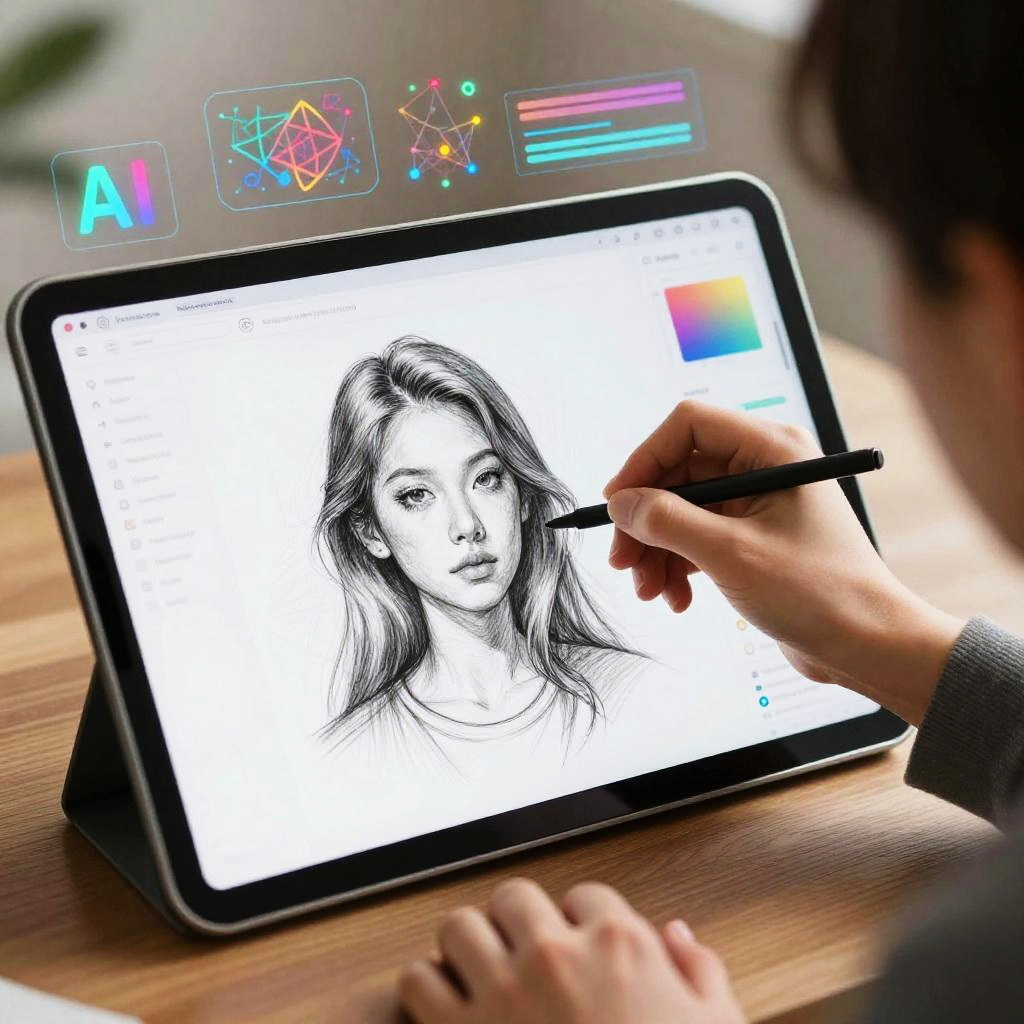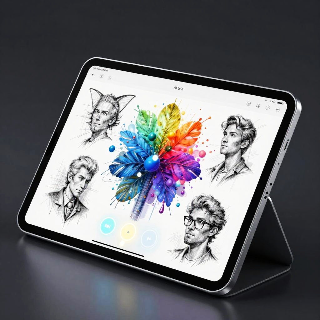 AI draw anything digital concept showing a transparent tablet displaying AI-generated artwork, multiple sketches transforming in real-time, with glowing touch controls, sleek futuristic design, vivid colors, and a highly creative atmosphere
