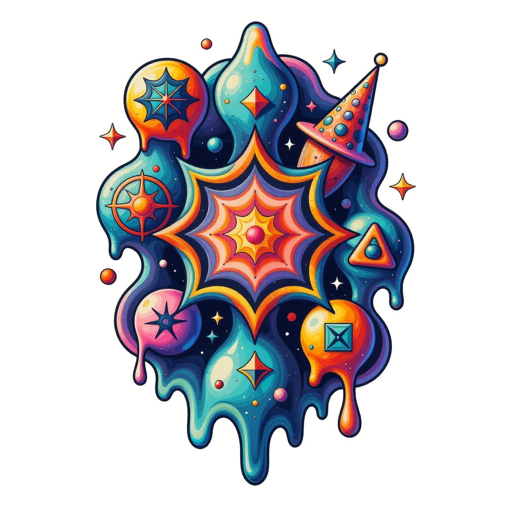 Vibrant digital artwork of a colorful, dripping starburst filled with orange, blue, and purple geometric shapes, stars, and a party hat.