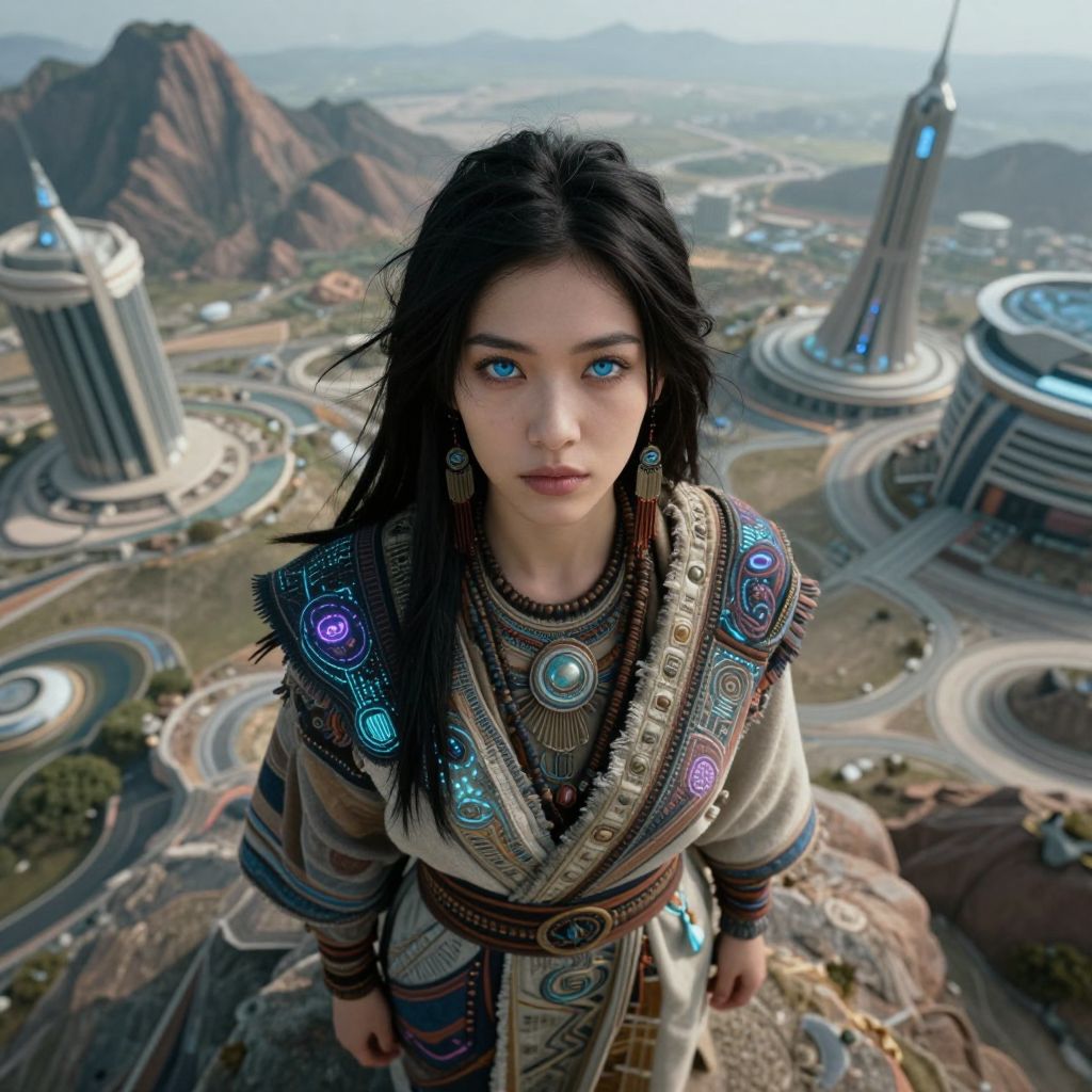 A mesmerizing portrait immerses the viewer in a surrealistic landscape, portraying an enigmatic individual with captivating blue eyes. The subject is elegantly draped in a fusion of ancient tribal garments and futuristic digital motifs. From a bird's-eye view, intricate details of their flowing attire intermingle with the contrasting terrain below—a harmonious blend of rugged mountains and sleek modern structures. Soft, ethereal light washes across the scene, highlighting the enigmatic gaze, drawing the observer into this captivating world where time seems to flow seamlessly between eras.