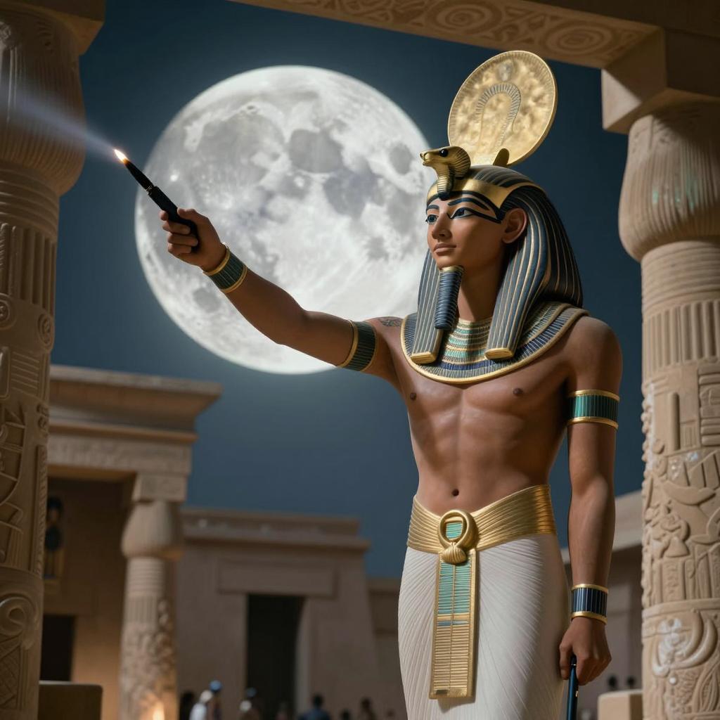 Brush Pen photograph of Khonsu, Egyptian god of the moon. a young man with a side lock of hair, and on his head a rearing cobra and a lunar disk. Standing in his temple, commanding the night sky. Cinematic still shot, dramatic, epic lighting.,