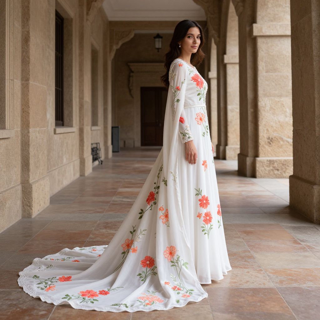 Elegant woman standing in a grand stone corridor, wearing a flowing white gown adorned with vibrant coral and orange floral embroidery, complemented by delicate green accents and a sheer train cascading gracefully onto the terracotta-tiled floor.