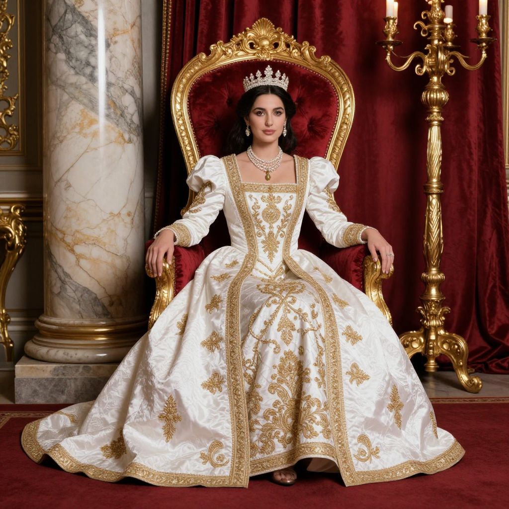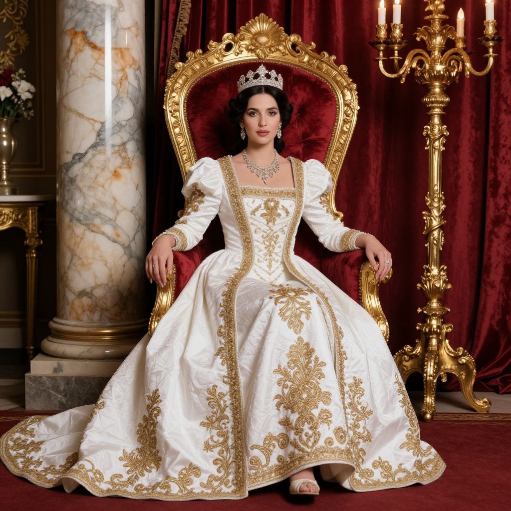 Photograph of a regal woman seated on an ornate, gold-trimmed, red velvet throne. She wears an elaborate, white, gold-embroidered gown with puffed sleeves and a full skirt, adorned with intricate patterns. A sparkling silver crown sits on her dark, wavy hair, and she wears a necklace and matching earrings. The background features rich red curtains, a marble column, and an elegant gold candelabrum with lit candles. The setting exudes opulence and royalty, with the woman's poised, confident expression enhancing her commanding presence.