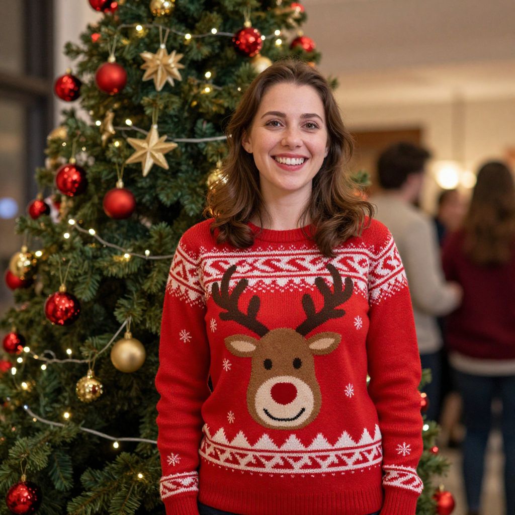 Joyful woman wearing a festive red Christmas sweater featuring a smiling reindeer design stands in front of a beautifully decorated Christmas tree adorned with red ornaments and twinkling lights, surrounded by a warm, celebratory atmosphere with blurred figures in the background.