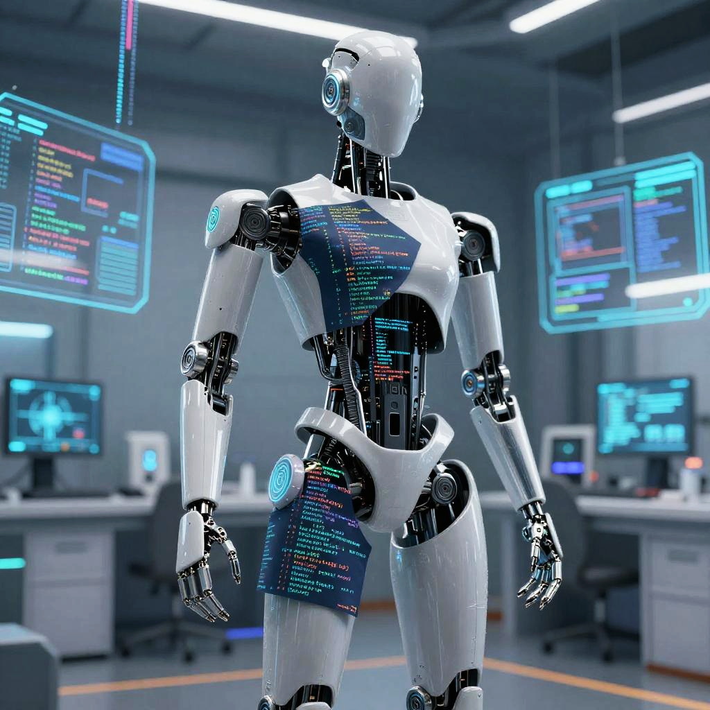 Train AI concept art showing a robotic hand manipulating complex algorithms on a virtual screen filled with floating data symbols, a dark background with sharp neon highlights, conveying futuristic artificial intelligence development and machine learning processes.