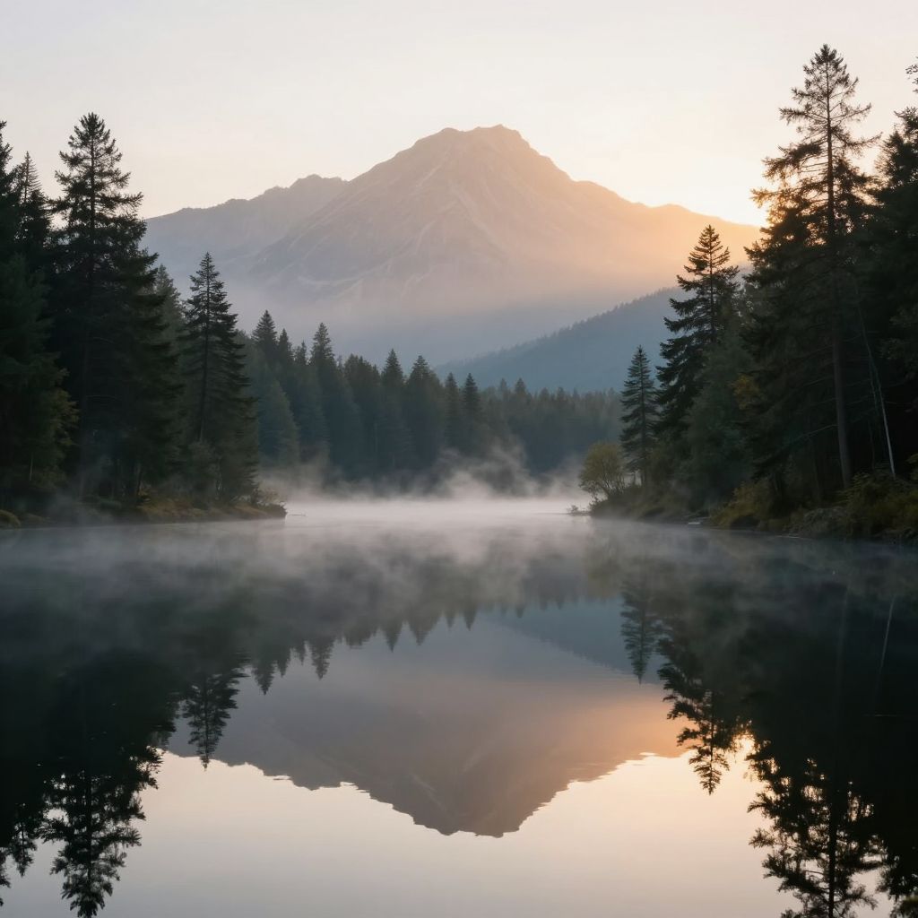 Snow-Capped Mountain Over Forest and Lake