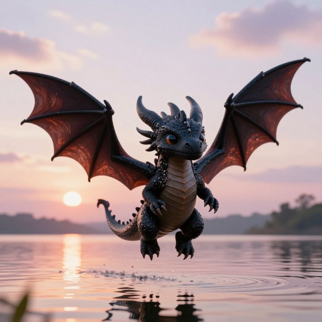 Photograph of a small, black, textured dragon toy with red eyes and bat-like wings, mid-jump above a reflective, calm lake. The dragon has detailed scales, small horns, and a brown underbelly. The background features a pink and orange sunset with soft clouds, and a distant tree line along the horizon. The dragon's reflection ripples in the water below, adding a magical, whimsical touch to the scene. The overall atmosphere is serene yet playful.