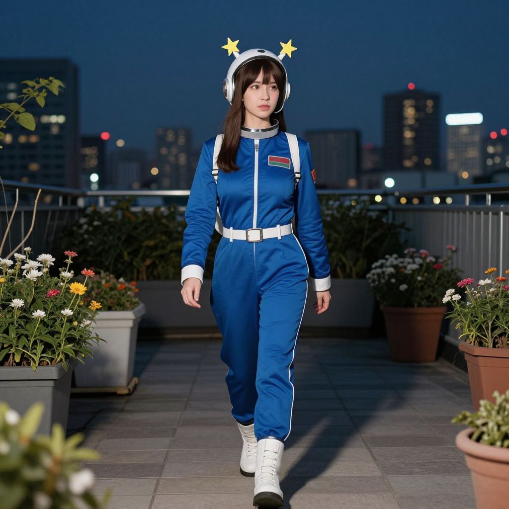 A casually dressed woman on a quiet evening stroll in a creative costume — a retro space explorer outfit with a blue jumpsuit, astronaut boots, and a headpiece with star-shaped decorations, walking through a rooftop garden at night with city skyline in the background, her face is youthful, with straight brown hair falling over one shoulder and a calm, curious expression. The woman has big tits and cute face