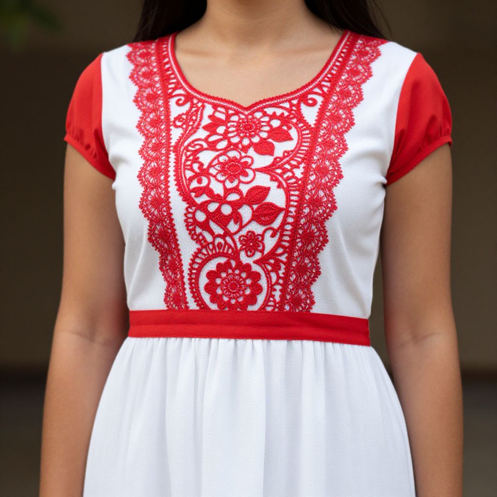 "Traditional Dress World, a close up of a woman in a white and red dress"