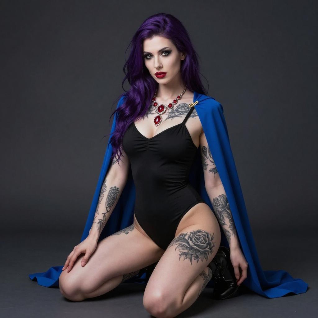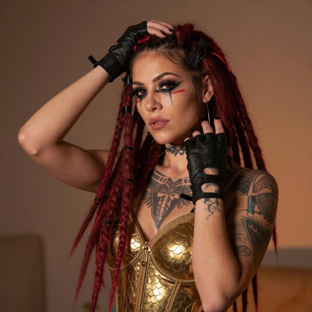 Photograph of a tattooed woman with red dreadlocks, wearing a gold scale-patterned top and black fingerless gloves. She has black face paint with a red line under her right eye. Her right hand touches her head, and her left hand rests near her chin. The background is blurred with warm, orange hues.