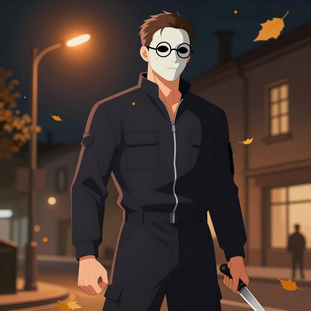 Digital illustration of a person with glowing eyes, wearing a dark hat and high-collared jacket, standing in a red-lit landscape. Background includes a red sky, dark clouds, and silhouetted trees and distant structure. Person's face is serious. Red and yellow ribbon on ears.
