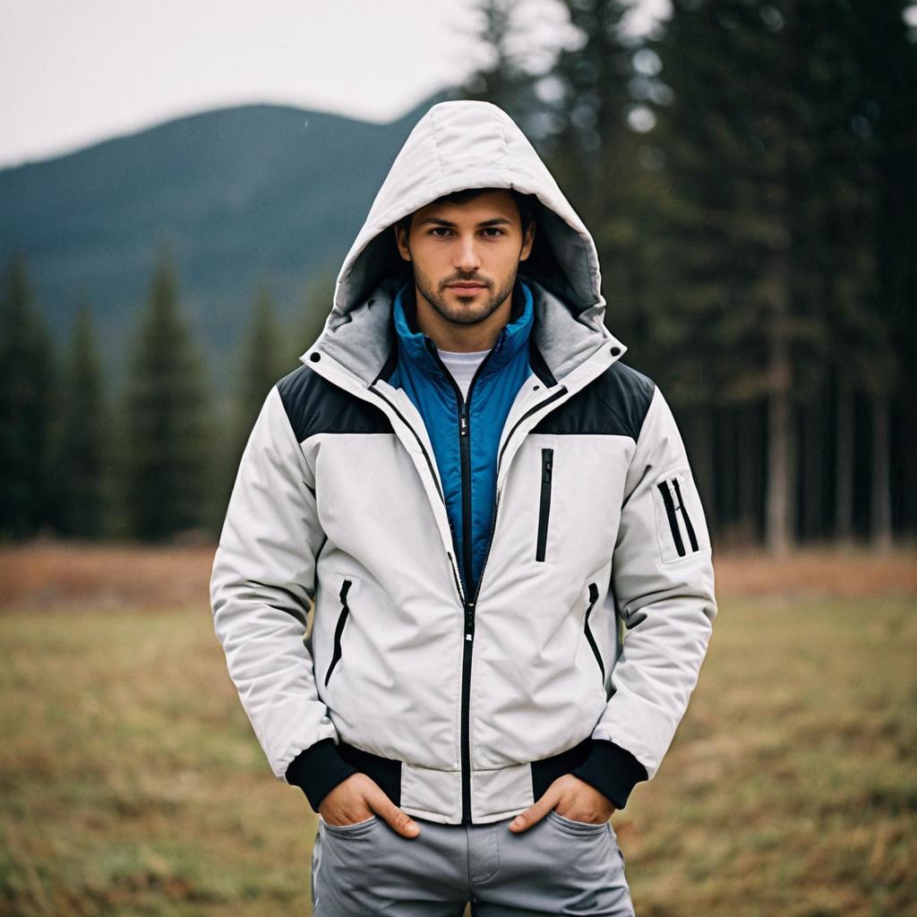 Ice climbers,1boy, solo, male focus, brown hair, jacket, gloves, realistic, facial hair, looking at viewer, pink jacket, brown eyes, pants, short hair