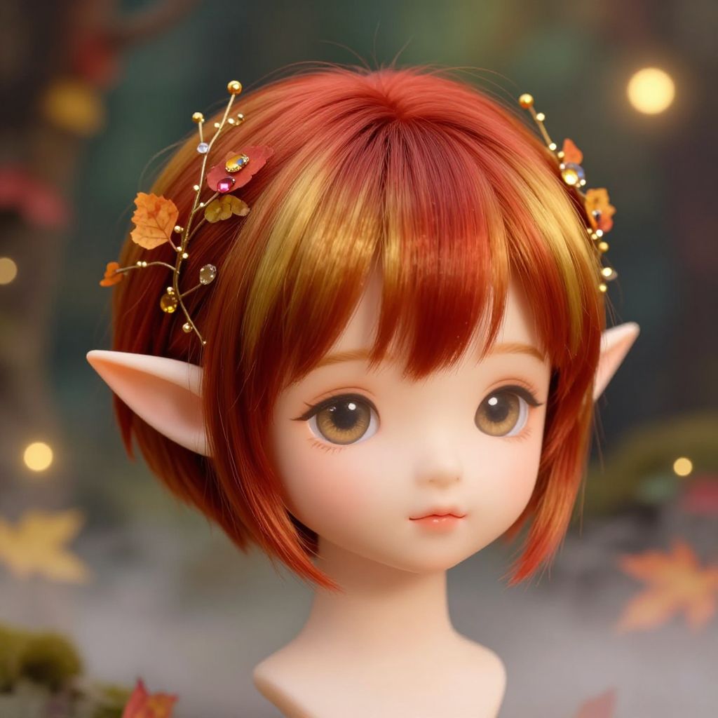Cute elf hairstyles showcasing short pixie cuts with sharp angled bangs, adorned with small gems and twinkling vines, vibrant autumnal hues blending crimson and gold, mystical forest aura with soft glowing orbs and gentle fog.